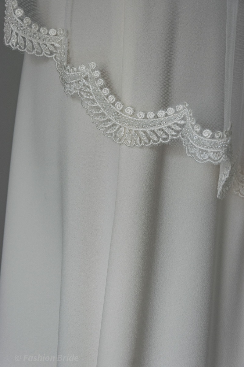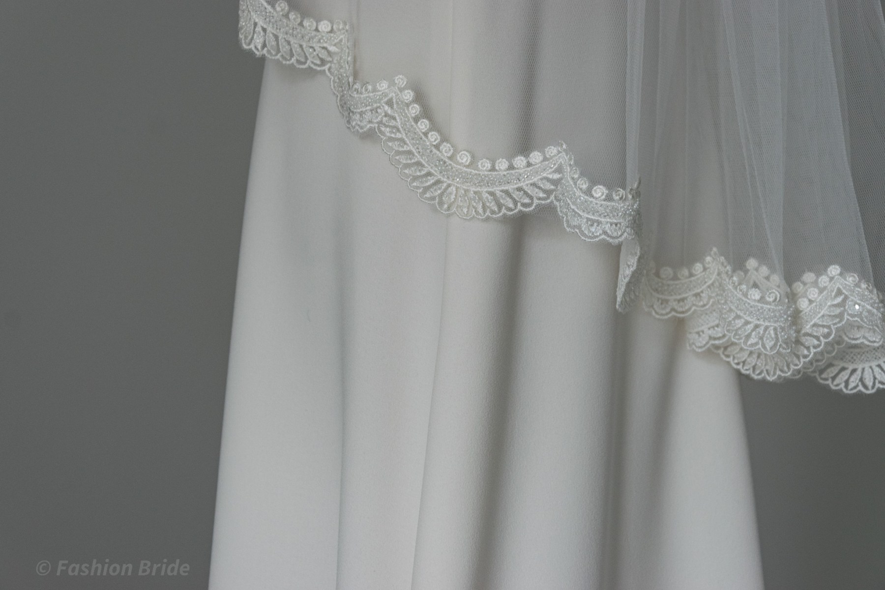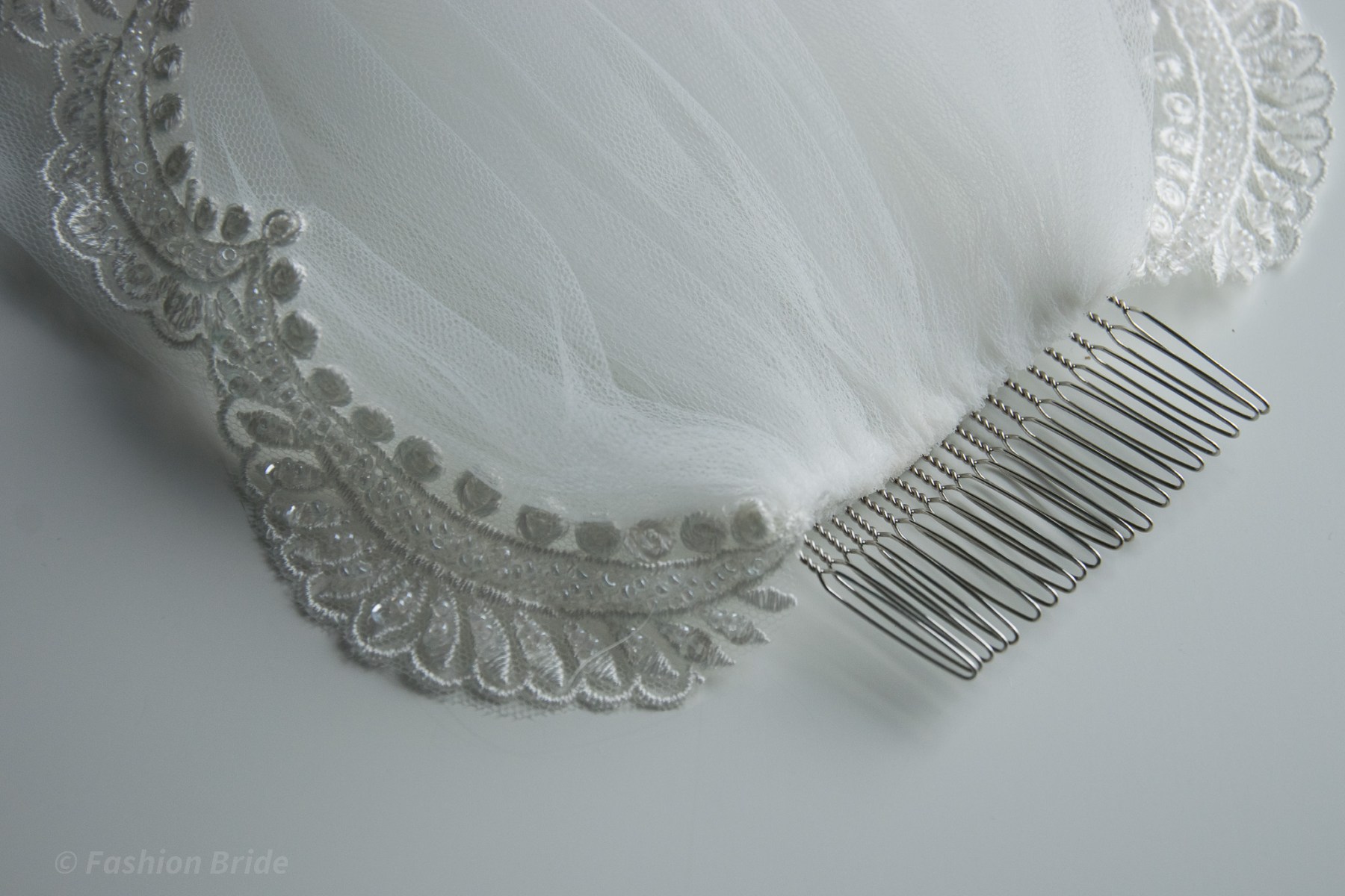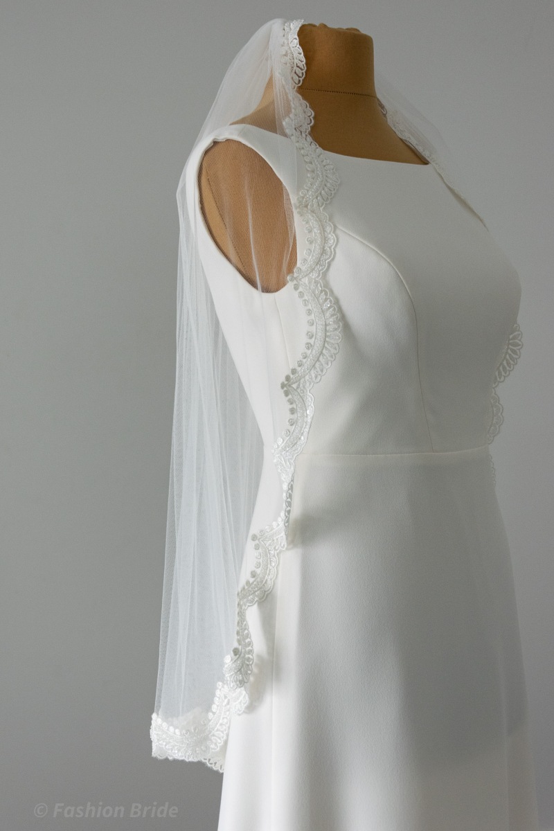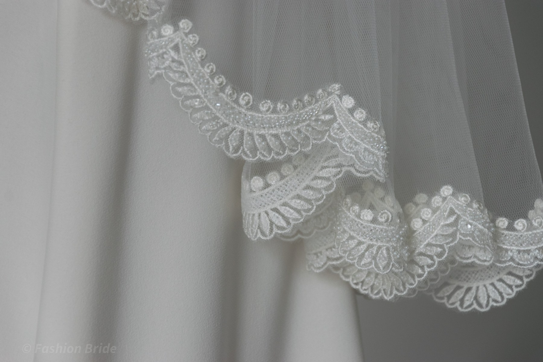 Description: Short Bridal tulle Veil Fingertip Length with beaded lace edge. The design of the Veil is available in Ivory and Cream colours. The width of the lace is 4 cm.