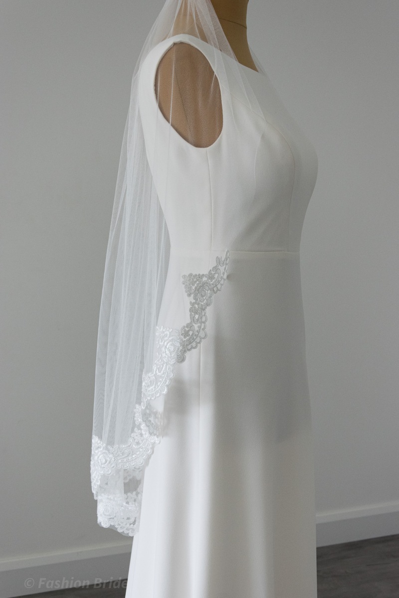 Description: Fingertip length Veil with corded lace edge. The design of the Veil is available in Ivory and Cream colours. The width of the lace is 8 cm.