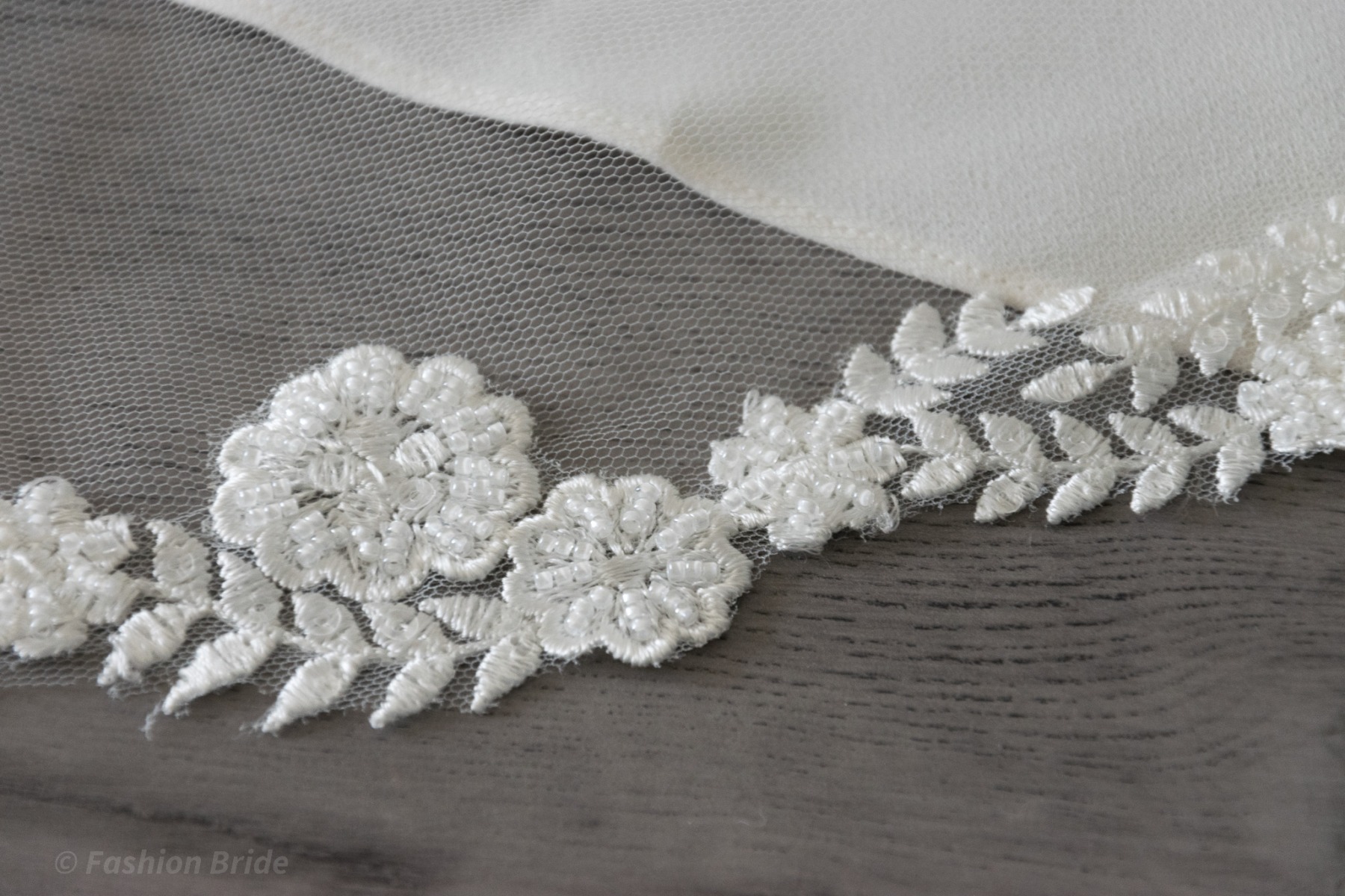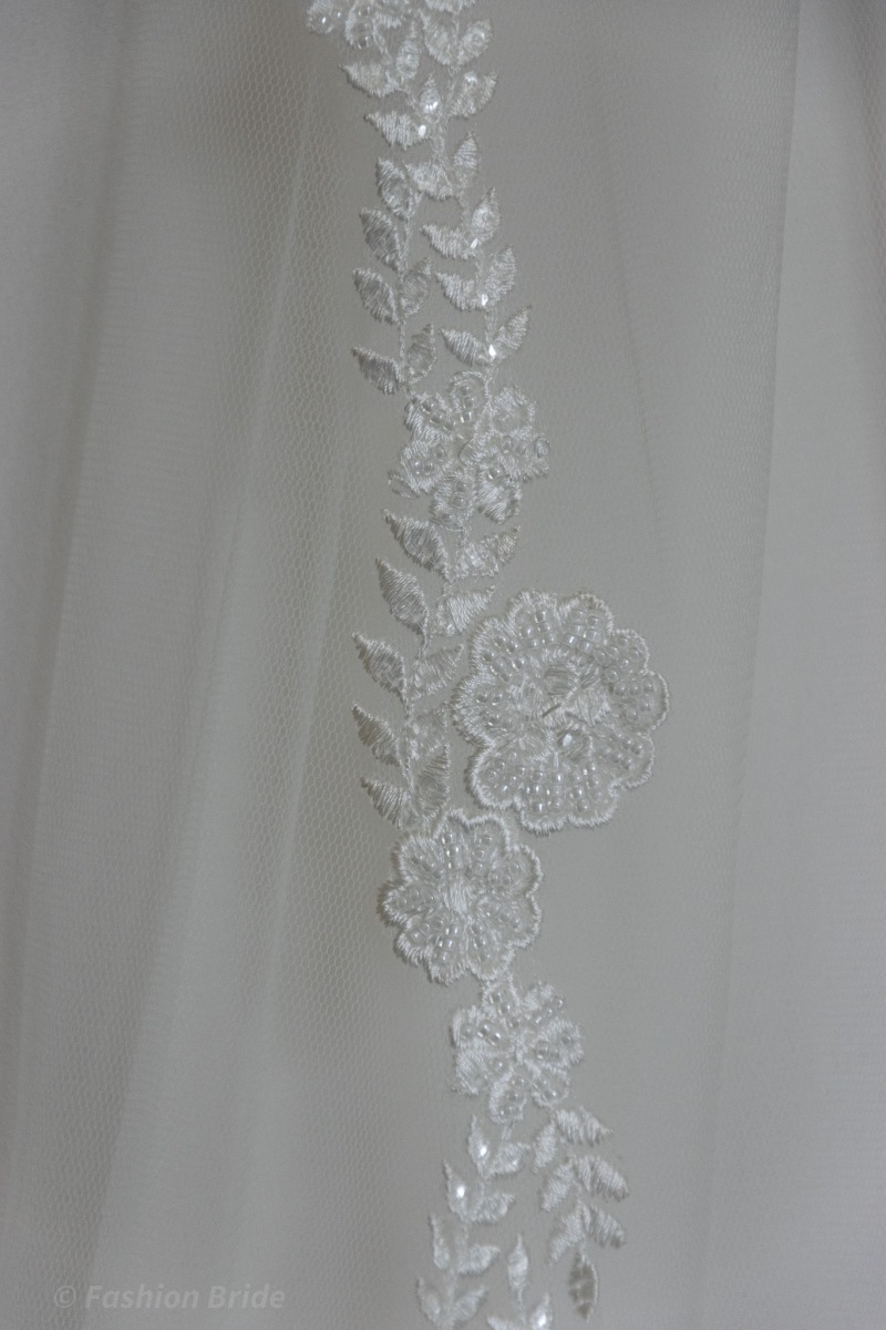 Description: Long Bridal tulle single-layer veil with beaded lace edge.