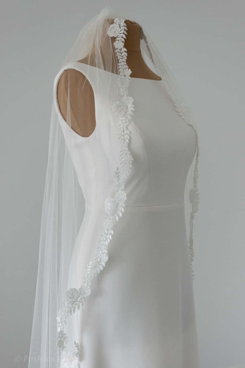 length: The design of the Veil is available in two most popular lengths 94”/ 240 cm Chapel Length Veil or 114” / 290 cm Cathedral Length Veil