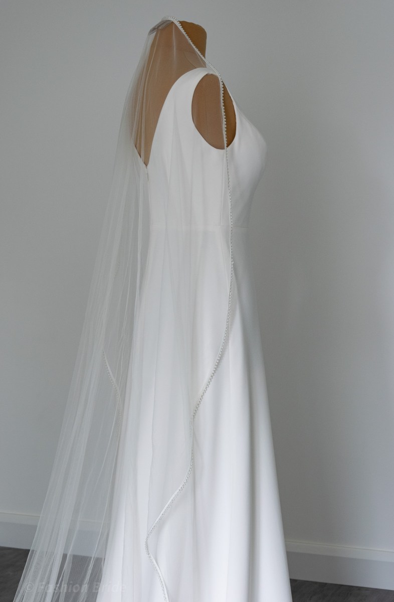 Description: Long Bridal tulle Veil with Pearl ribbon edge. The design of the Veil is available in Ivory and Cream colours. The width of the pearl ribbon is 1 cm. The Veil is available in two most popular lengths Chapel Length and Cathedral Length.