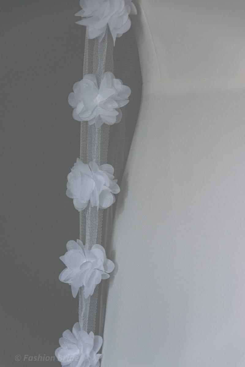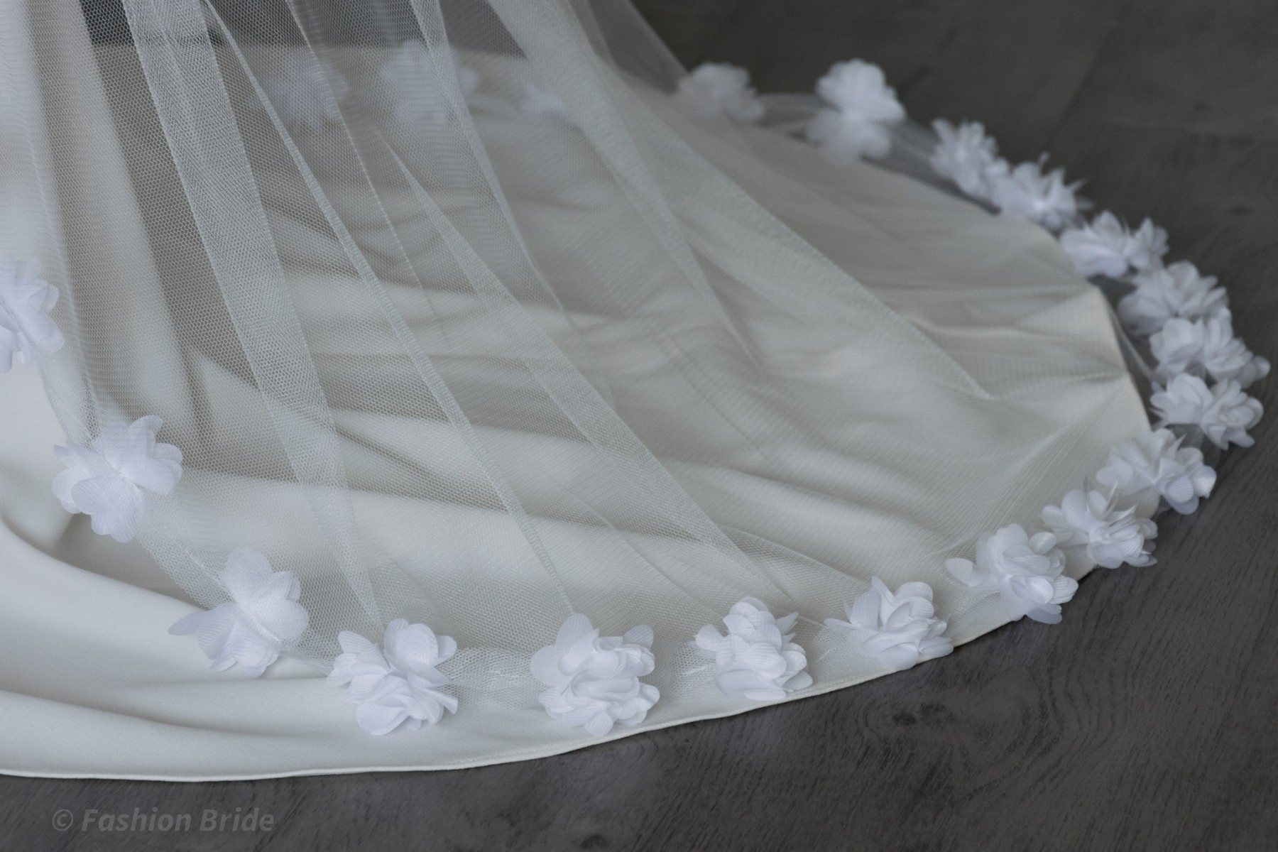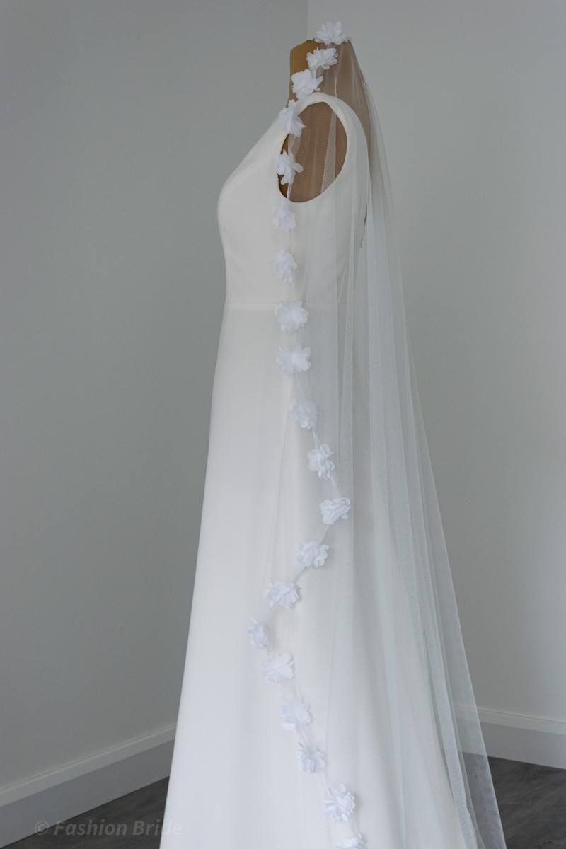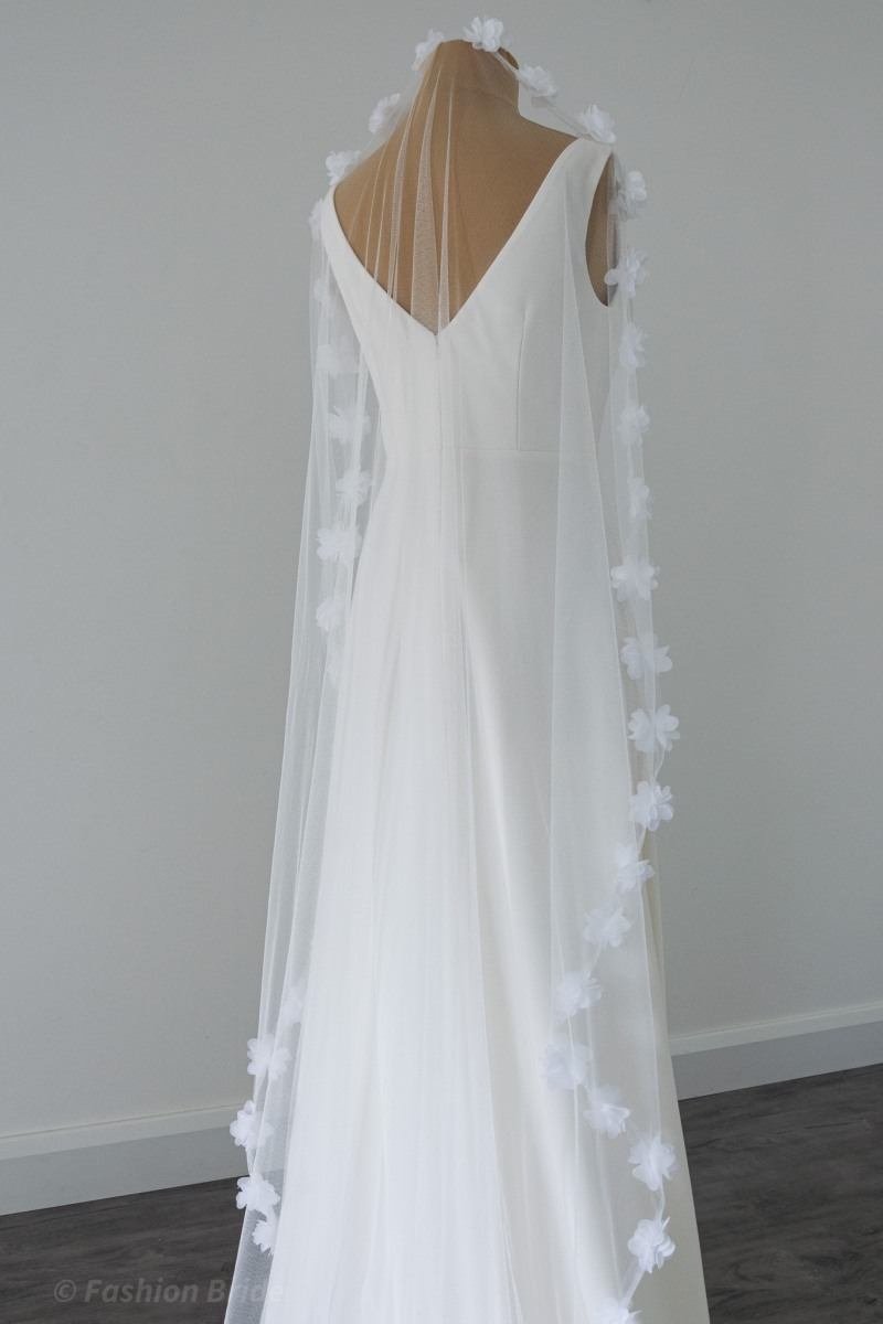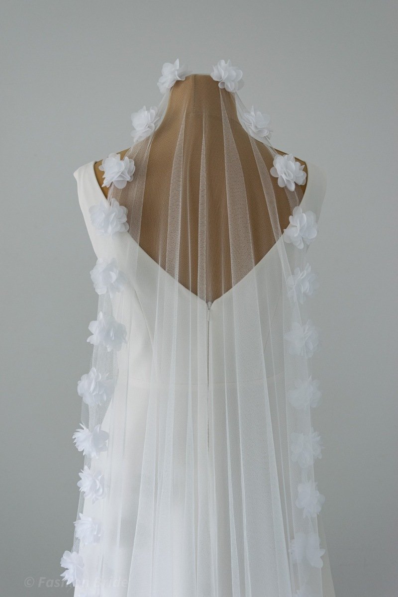 Description: Long Soft tulle Veil with Flowers edge. The design of the Veil is available in Ivory colour. The width of the flowers is 5 cm. The Veil is available in two most popular lengths Chapel Length and Cathedral Length.