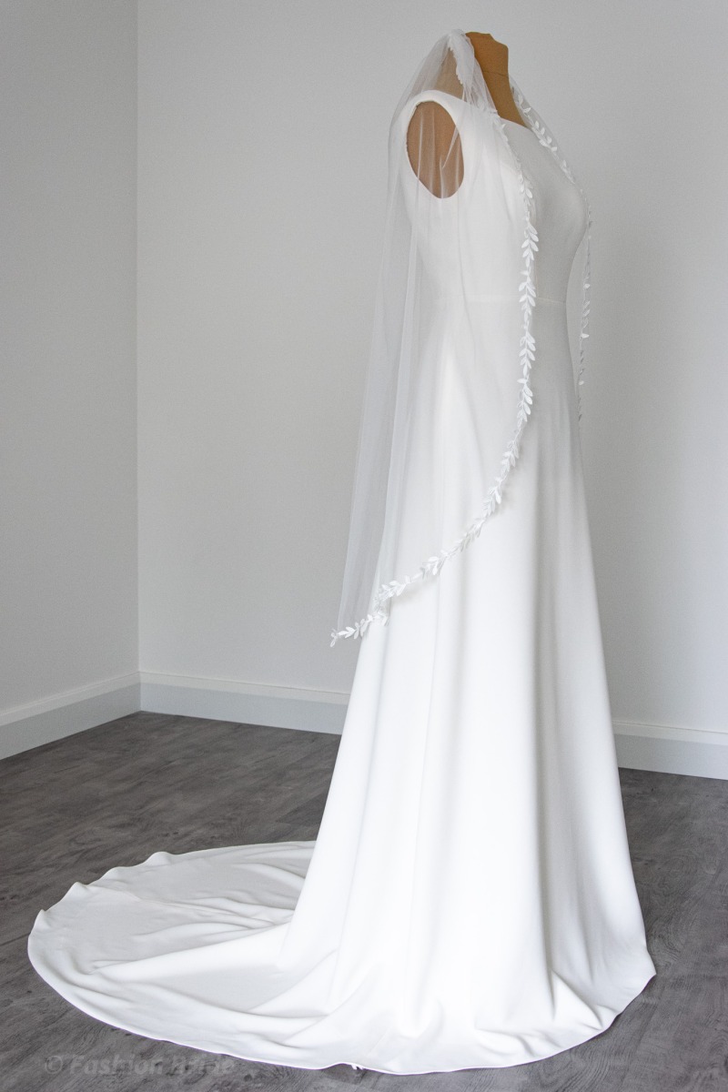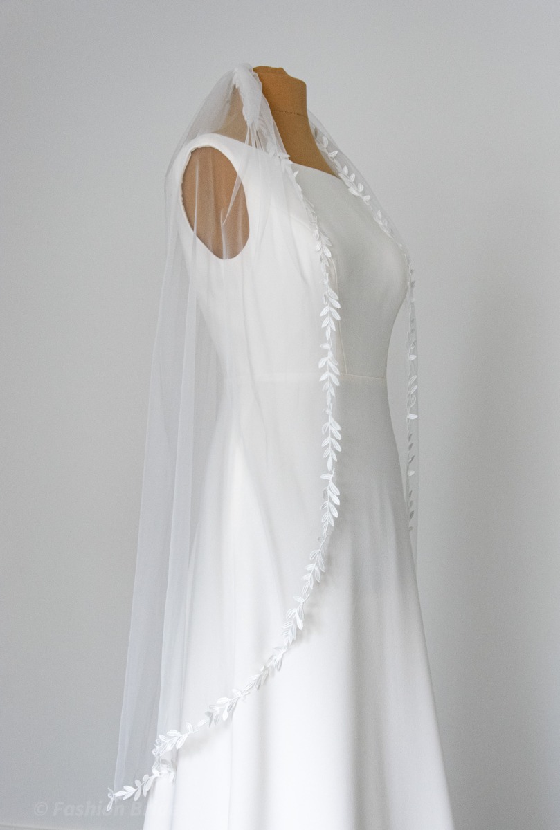 On the photo: Fine tulle veil 150cm (60”) Width, Fingertip Length with leaf lace edge finish in Ivory colour.