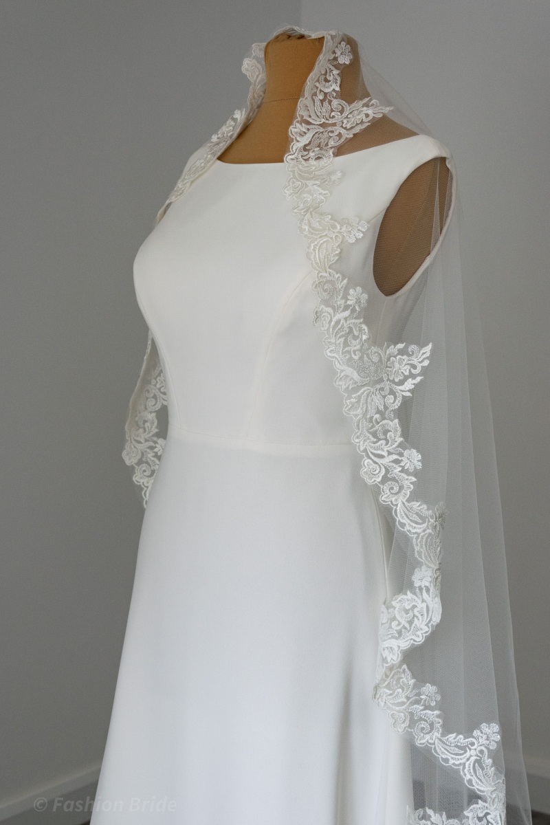 Description: Short one-tier style lace-edged tulle veil. The lace width is 12 cm, Cream colour.