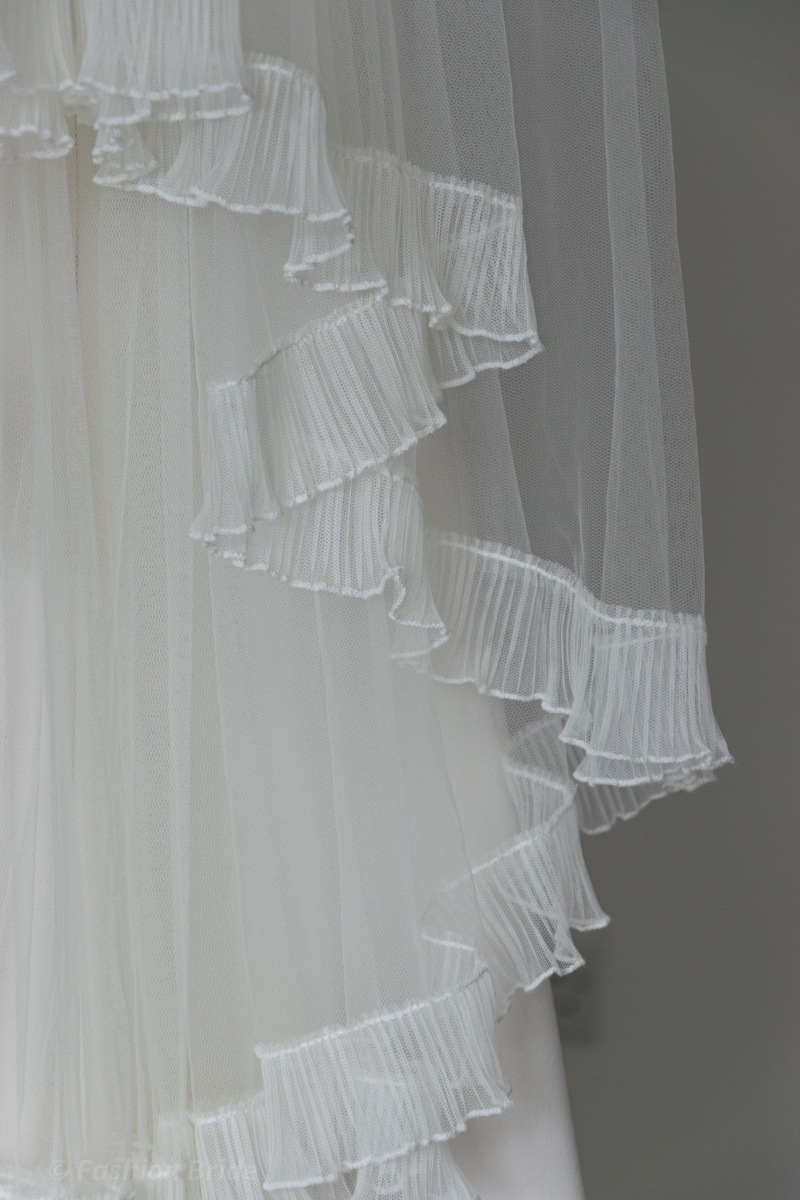 Shown in the photo: Bridal tulle two-tier Veil with frill edge trim, 150 cm (60”) Width, Top Layer is 50 cm, Fingertip Length, Cream (dark ivory).