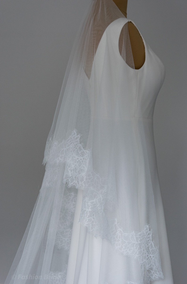 Description: Long two-tier Bridal tulle Veil with delicate lace edge. The design of the Veil is available in Ivory colour. The width of the lace is 12 cm.