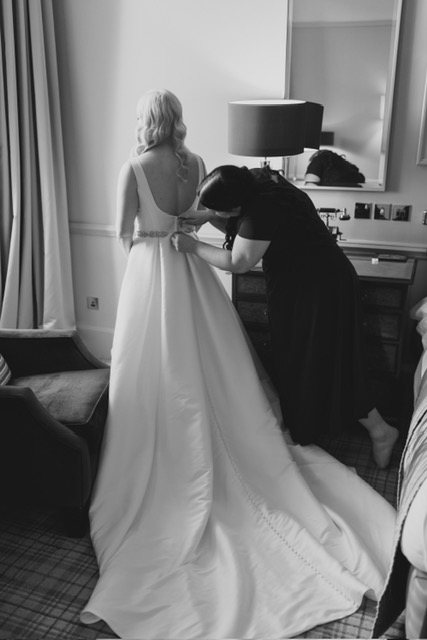 The shoes you plan to wear on your wedding day are essential, as they will affect how you stand in your dress and the length of your dress. Please remember to bring them along to every fitting appointment.